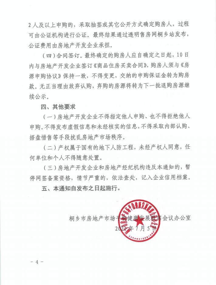 在完善合同撤销备案机制方面,自该通知发布之日起,已网签备案的《商品房买卖合同》经买卖双方协商一致解除,房地产开发企业撤销合同备案的,则该房源需通过透明售房网桐乡站进行公开销售。