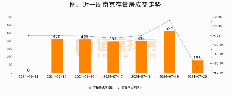 从存量房来看,2024年07月20日南京存量房单日成交155套,比昨日减少369套,环比下降70.4%。从近一周存量房成交来看,南京存量房日均成交套数为329套,07月20日单日成交155套,低于近一周平均水平52.9%。