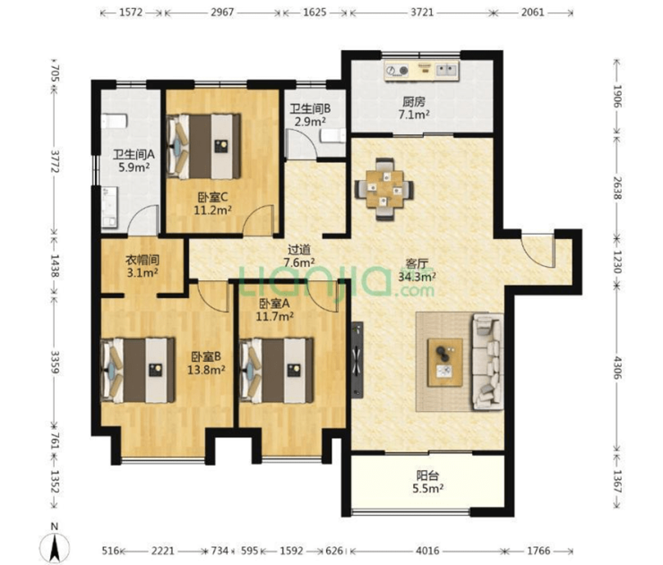 以翡翠X园建面约137㎡的3房2卫户型为例,客厅和阳台的开间不到4.2米,全家人在客厅小聚有些拥挤,偶尔有客人来访更是显得局促。