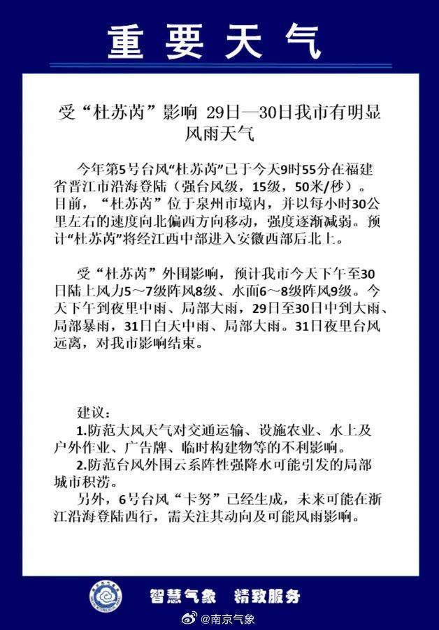 “杜苏芮”今天9时55分在福建晋江沿海登陆,登陆时中心附近最大风力15级(50米/秒,强台风级)。预计“杜苏芮”登陆后继续向西北方向移动,强度逐渐减弱。