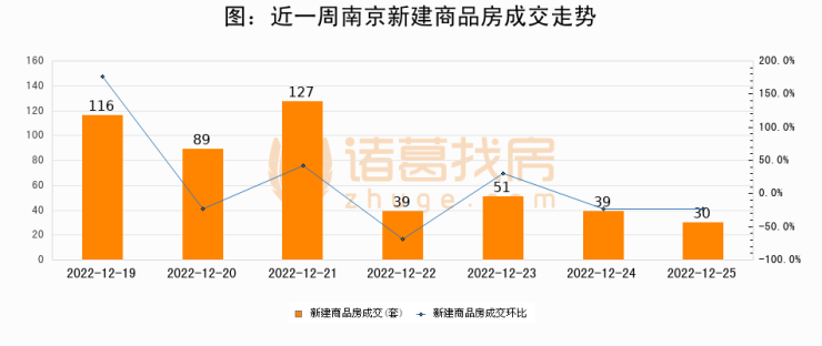 根据南京市住房保障和房产局数据显示,2022年12月25日南京新建商品房成交30套,较昨日减少9套,环比下降23.1%