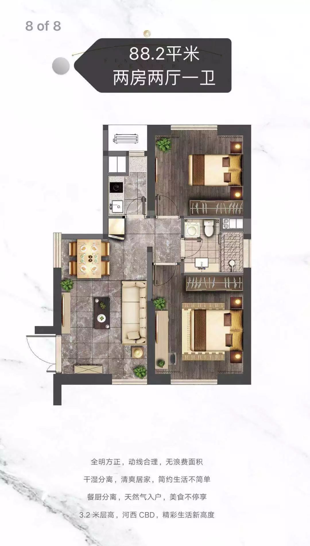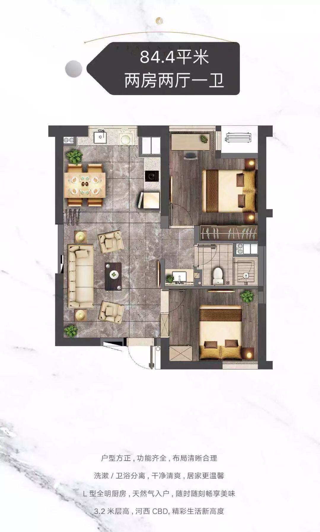 户型方正实用,布局紧凑;功能分区明显,干湿分明;客厅面宽4.4平米,采光条件优越;卫生间电热毛巾架人性化设计。