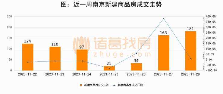 根据南京市住房保障和房产局数据显示,2023年11月28日南京新建商品房成交181套,较昨日增加18套,环比上涨11%