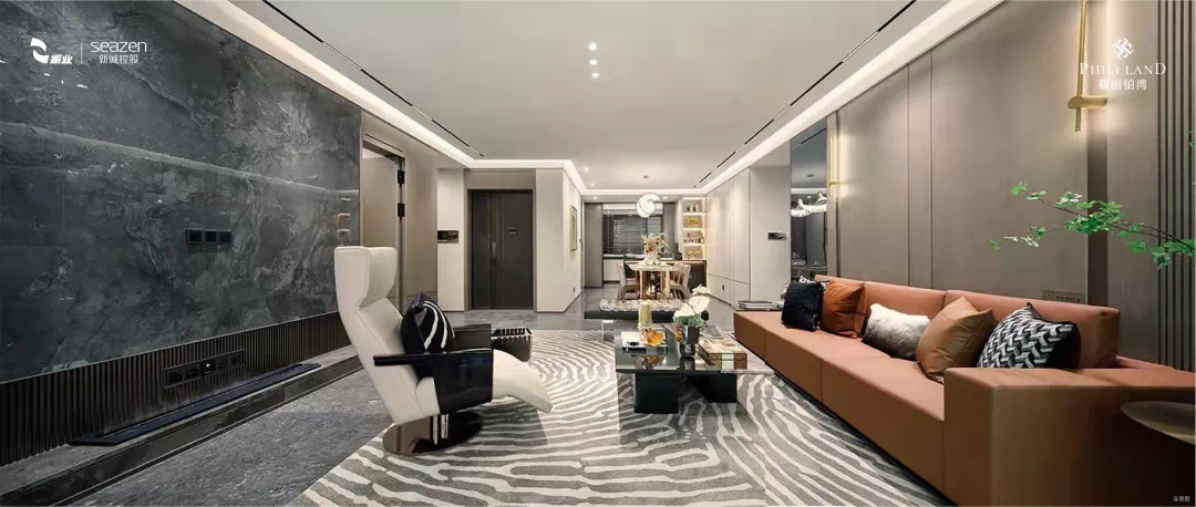 背景墙采用整体岩板辅助金属线条包边的工艺,非常有质感,客餐厅及公共过道地面全部采用印记灰天然大理石铺装,细节之处,采用了金属线条的踢脚线装饰,这全部都是传统豪宅标准配置。而且翡丽铂湾也是目前板块内少有一个采用天然石材的项目。