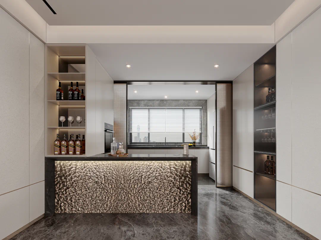 餐厅墙面采用金属线条和皮质搭配,餐厅北侧为中西岛台设计,台面采用劳伦金黑色岩板设计,同时配备隐藏式面板,台面右侧橱柜配置了德国博世的蒸烤一体机,这也是目前板块内少有有的配置。