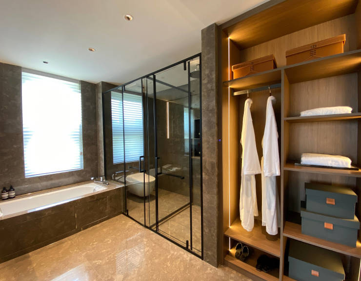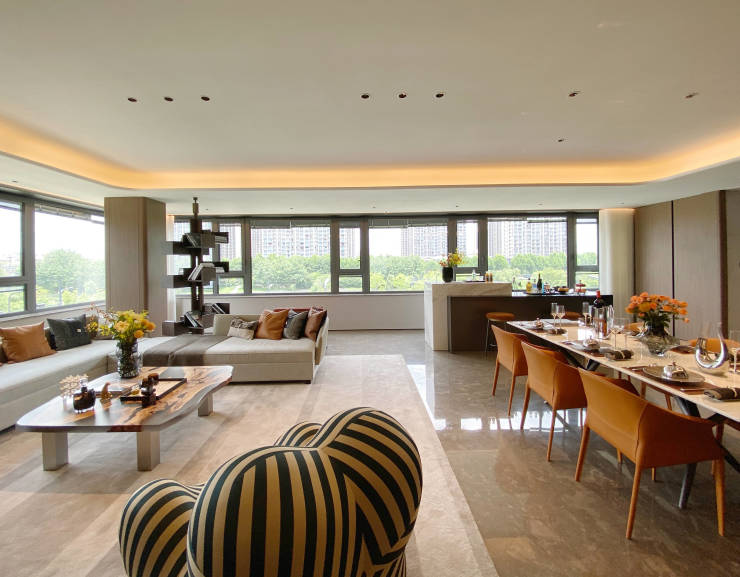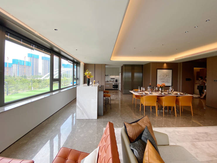 为了不辜负窗外秦淮河的景观资源,绿城·凤栖潮鸣创新“Amazing户型”,打造270°环幕落地全景大客厅,超转角全景视野,让滨水生活成为家里的永恒艺术品。LDKG一体化设计,客厅天然大理石铺陈,是南京豪宅极少数使用天然大理石的项目之一,天然大理石抗磨蚀,耐高温,可以经受住时间的考验,具有人造石所无法比拟的优势。客厅不仅是家庭聚场,更是社交场,澎湃壮阔的秦淮河,就是对朋友和家人的最好款待。