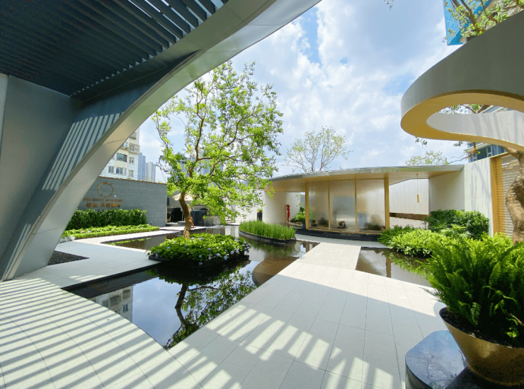 步入水上花园园区会客厅,自然植物与精工艺术的结合,水景铺陈、树木相迎,交织辉映的景观树阵以盛礼迎宾,通过植物精致搭配营造热烈,充满活力的空间氛围,弱化硬景与软景之间的边界感,将绿色与生活融为一体。