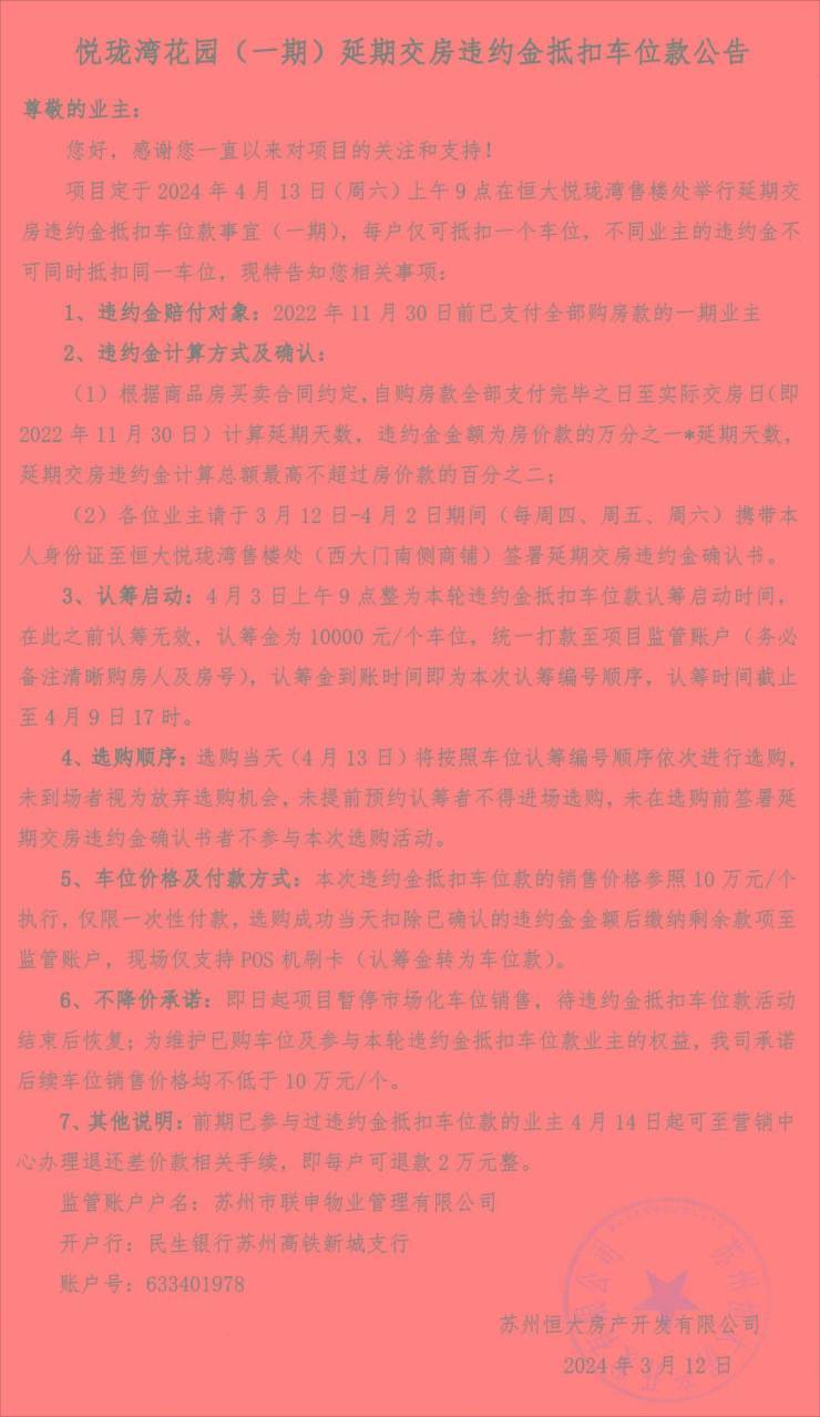近日,苏州市相城区恒大悦珑湾花园小区一则“延期交房违约金抵扣车位款”公告,引发业主们的讨论。