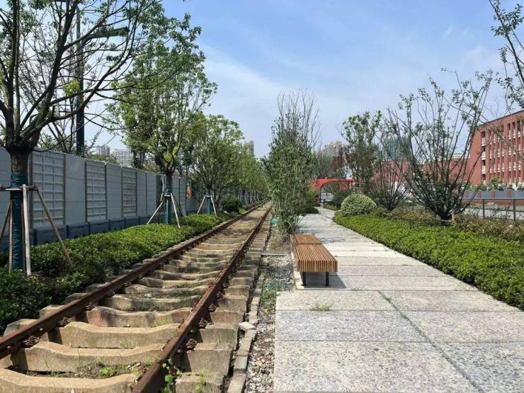 机场河与南部新城内的机场跑道生态轴、商务轴两轴平行。在地面、花坛、台阶、坐凳等铺装过程中,均采用了大校场机场跑道石,保留历史文脉。同时,在机场河南岸,一道废弃轨道安静地横卧于此,未来南部新城将利用轨道打造新场景,保留历史记忆,营造活力氛围。