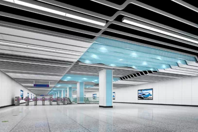 全线4座车站分为3个标准站和1个重点站。标准站的顶部个性区域表达及特色元素由周边区域人文特色艺术手法演化而来,墙面、柱面及地面做法与标准站统一。重点车站鱼嘴站开创了南京车站装修与艺术品一体化设计的先例,将艺术的气息融入整体装修的氛围中,形成了本站的特色。