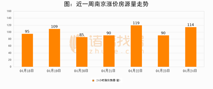 根据诸葛找房数据显示,南京24小时涨价房源量为114套,较04月23日增加24套,环比上涨26.7%。与此同时,涨价房源占比小幅扩大,业主信心有所提升。