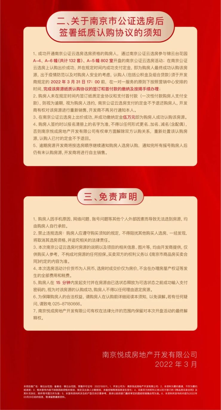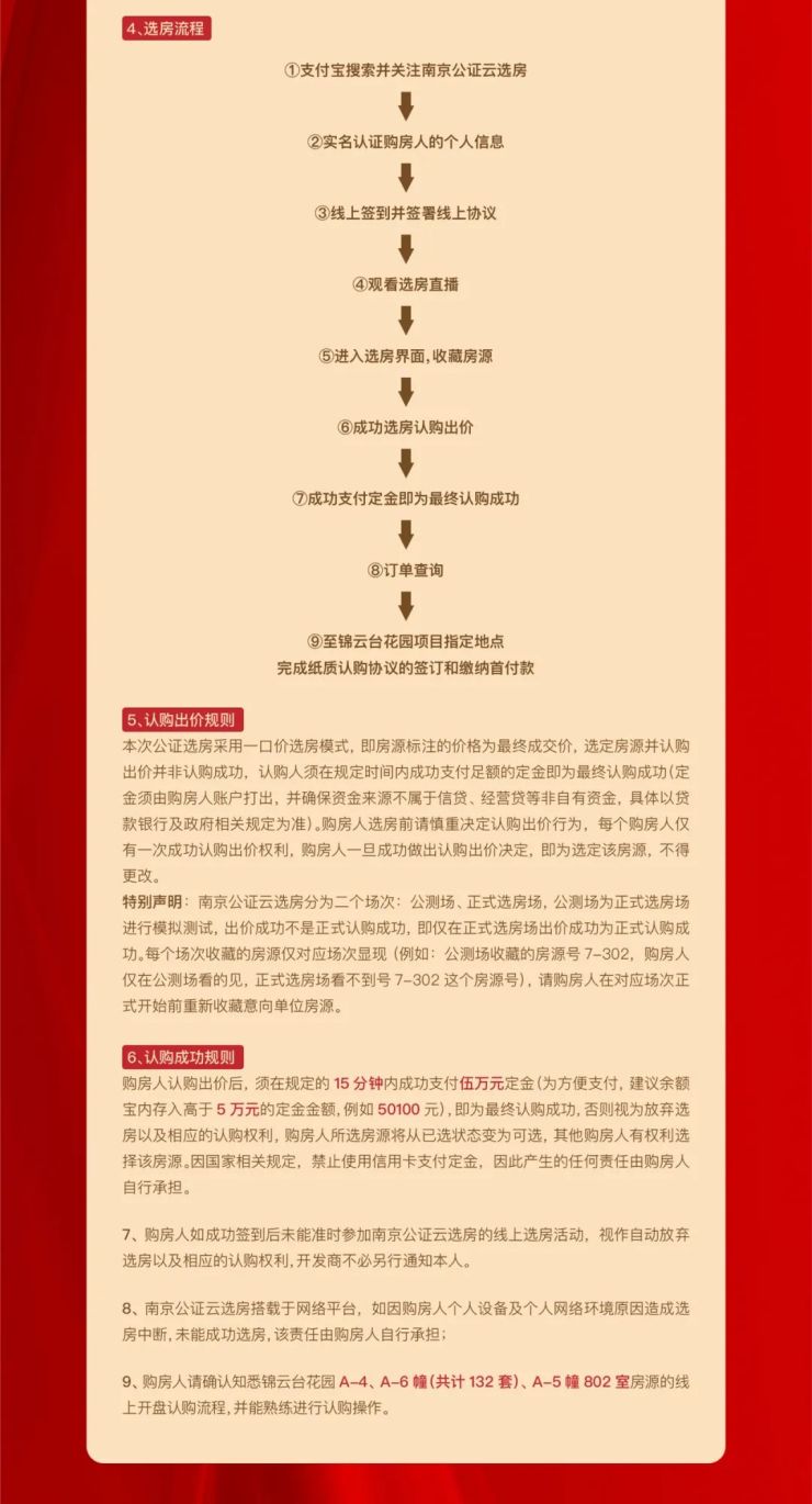 (a)本次南京公证云选房活动仅允许参加锦云台花园项目线上登记并成功登记的购房人参加(最终以南京市石城公证处公示的摇号购房人名单为准)。本次选房需使用支付宝,每个摇号家庭只允许一个支付宝账号用于参加南京公证云选房;