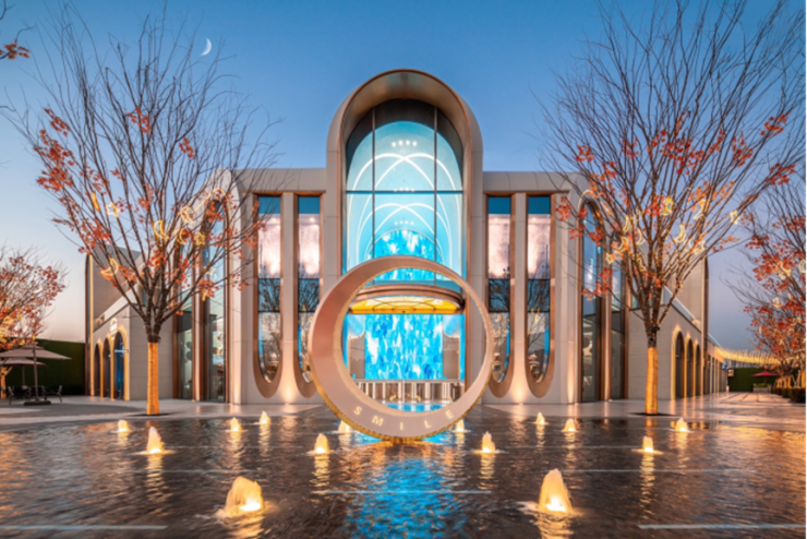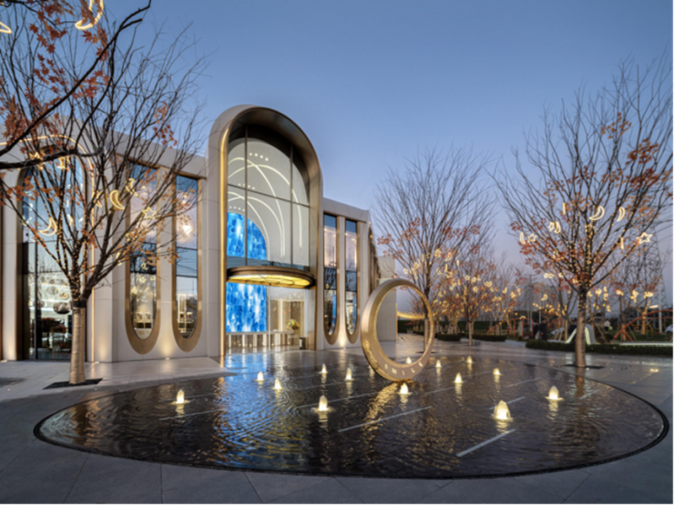 水景布置结合月亮雕塑,加上树梢悬挂的“弯月”照明,以及水影中倒映的斑驳月景,形成天上月与“水中月”的遥相呼应。