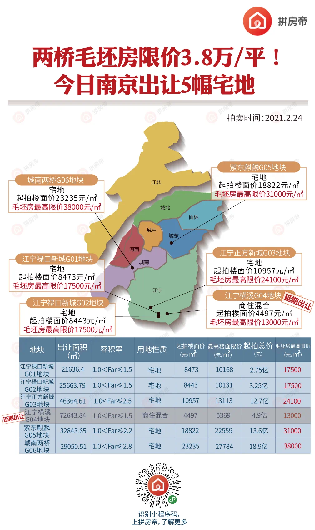 此次出让的地块,涉及城南两桥、正方新城及紫东、江宁等多个片区,其中两桥纯宅地未来毛坯房限价达3.8万/㎡。值得一提的是,江宁横溪G04地块已延期出让,限时竞价时间调整为3月11日。