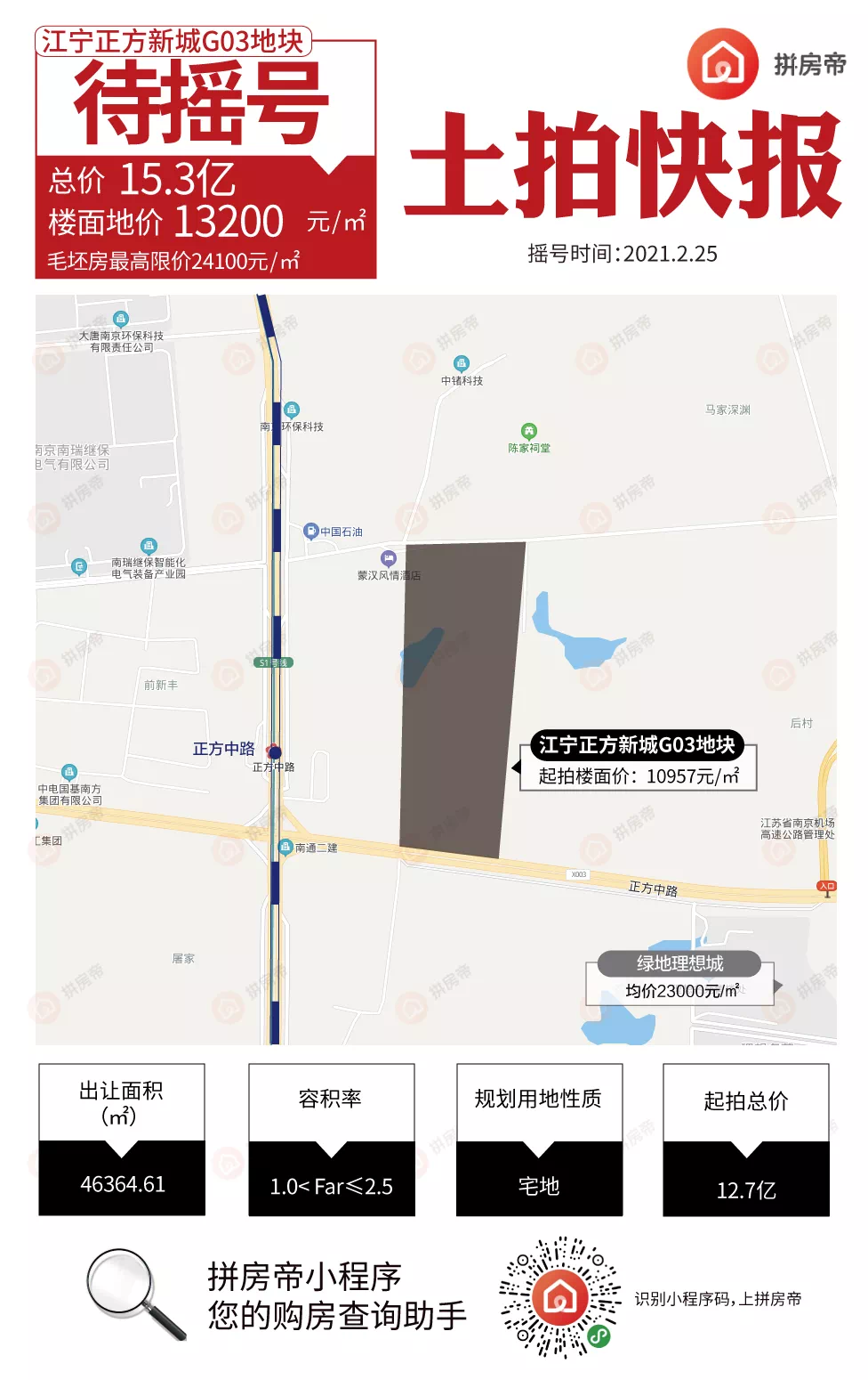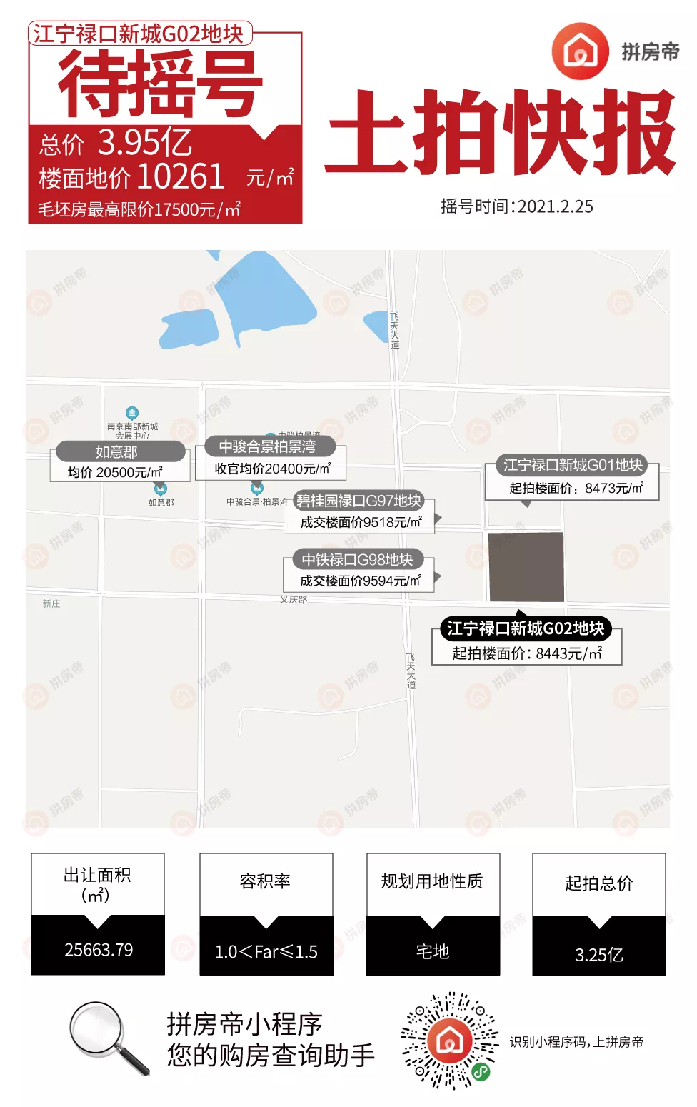 02江宁禄口G02地块起拍楼面价:8443元/㎡较高楼面限价:10131元/㎡毛坯房销售限价:17500元/㎡
