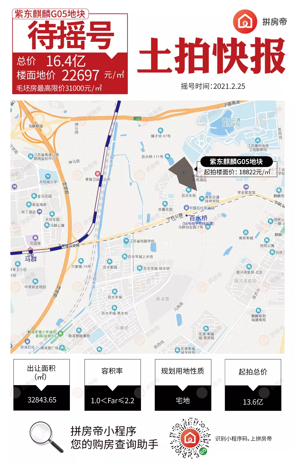 1、江宁禄口G01地块经过12轮竞价,待摇号,预计未来成交楼面价为10322元/㎡,总价3.35亿元2、江宁禄口G02地块经过14轮竞价,待摇号,预计未来成交楼面价为10261元/㎡,总价3.95亿元3、正方新城G03地块经过26轮竞价,待摇号,预计未来成交楼面价为13200元/㎡,总价15.3亿 元4、麒麟G05地块经过28轮竞价,待摇号,预计未来成交楼面价为22697元/㎡,总价16.4亿元5、城南两桥G06地块经过38轮竞价,待摇号,预计未来成交楼面价为27907元/㎡,总价22.7亿元