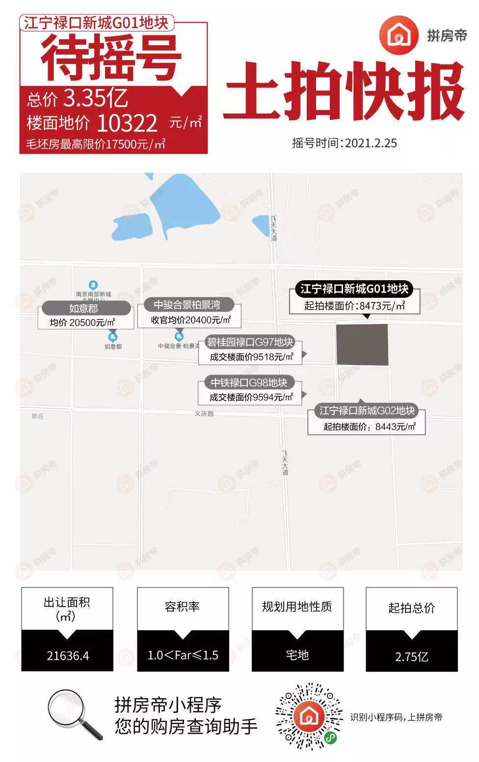 01江宁禄口G01地块起拍楼面价:8473元/㎡较高楼面限价:10168元/㎡毛坯房销售限价:17500元/㎡