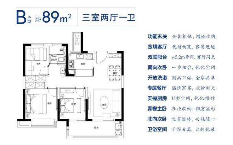 建面约89㎡的3室2厅1卫,三开间朝南,双阳台阳台设计,隔离卫浴,全家共享,U形厨房,动线科学,飘窗和阳台都做了转角。