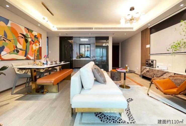 建面约110㎡的3室2厅2卫,做了横厅设计,厨餐客一体化,主卧套房设计,自带独卫和衣帽间,阳台和飘窗做了转角设计。