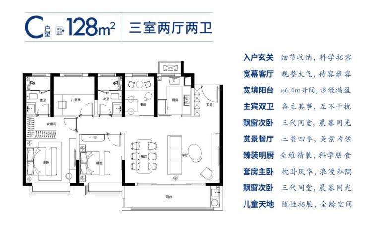 三个户型都是南向三开间起步、带有南向双阳台尺度阔绰,为了有效保障了采光和视野,还打造了270度转角设计。110、128㎡则采用了时下流行的大横厅设计。