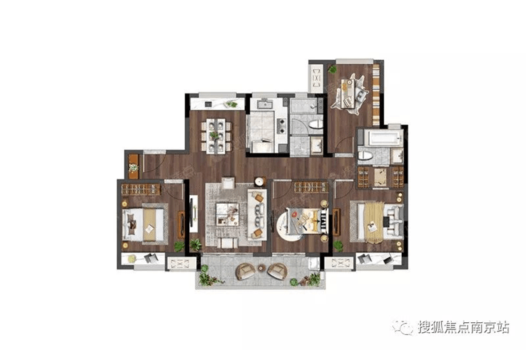 129㎡户型是四房两厅两卫的设计,四开间朝南,可以说是较大程度上扩大采光面,其中一个南向次卧和客厅的阳台相连,将空间利用率达到较大,主卧和另外一个南卧都拥有飘窗设计,餐客厅相连,餐厅还有飘窗设计,使得整个户型更为通透,卫生间做到干湿分离。