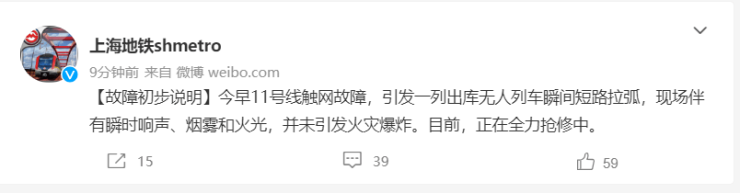 9点30分左右,@上海地铁shmetro发布消息称,今早11号线触网故障,引发一列出库无人列车瞬间短路拉弧,现场伴有瞬时响声、烟雾和火光,并未引发火灾爆炸。目前,正在全力抢修中。
