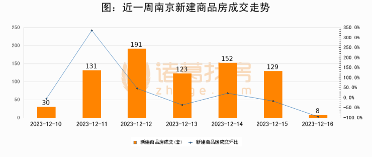 根据南京市住房保障和房产局数据显示,2023年12月16日南京新建商品房成交8套,较昨日减少121套,环比下降93.8%