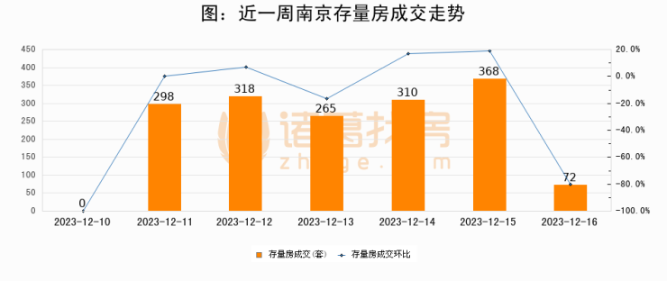 从存量房来看,2023年12月16日南京存量房单日成交72套,比昨日减少296套,环比下降80.4%。从近一周存量房成交来看,南京存量房日均成交套数为233套,12月16日单日成交72套,低于近一周平均水平69.1%。