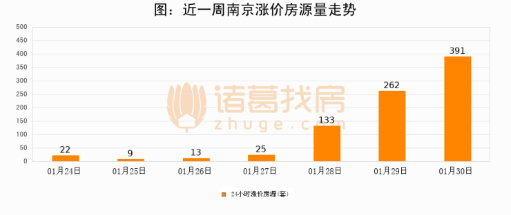 根据诸葛找房数据显示,南京24小时涨价房源量为391套,较01月29日增加129套,环比上涨49.2%。与此同时,涨价房源占比小幅扩大,业主信心有所提升。