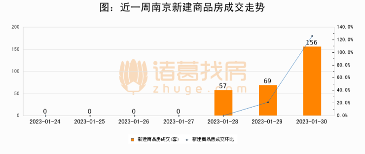 根据南京市住房保障和房产局数据显示,2023年01月30日南京新建商品房成交156套,较昨日增加87套,环比上涨126.1%