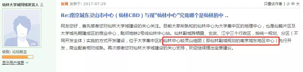 在一篇网友询问“南京四大“CBD”为何独缺城东?”的帖子中,网络发言人回复如下: