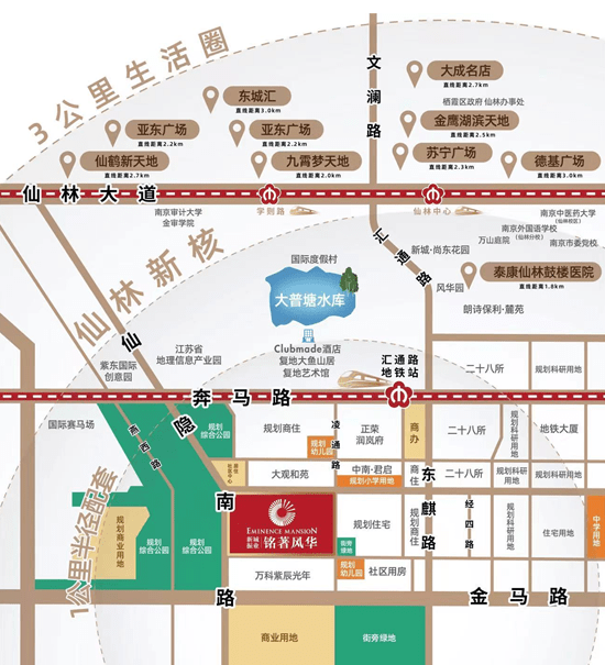 汇通路地铁站为圆心,以繁华可达的3公里为生活半径,划定醇熟完备的仙林生活圈:直距约3公里:九霄梦天地、东城汇和金鹰湖滨天地/金鹰奥莱城