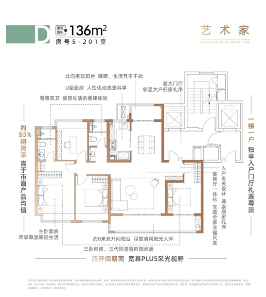 建面约136㎡户型,以阔绰舒适的四房两卫设计,装下全家人的幸福时光。全明格局,四开间朝南,主次卧南向大飘窗,片区少有三阳台布局,所到之处皆阳光;南北通透、动静分离,宽阔横厅尽享舒适空间,生活更从容。