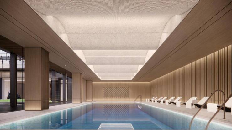 「取境瞻园的古今园林」。设计团队浓缩「瞻园的造园理念」,为园区高定配置约1000㎡美学会所,臻享恒温泳池、健身、私宴、儿童活动阅览等于一体的私享空间。
