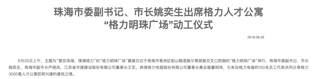 3个月后,据格力集团官方消息,“格力明珠广场”动工,这是格力自费投资20亿元建设的人才公寓,由2栋18层、3栋19层、3栋32层、3栋35层共11栋住宅,1栋商业及邻里中心及1栋幼儿园组成,占地面积约80719.95平方米,总建筑面积约为278402平方米。预计2021年交付共3180套。