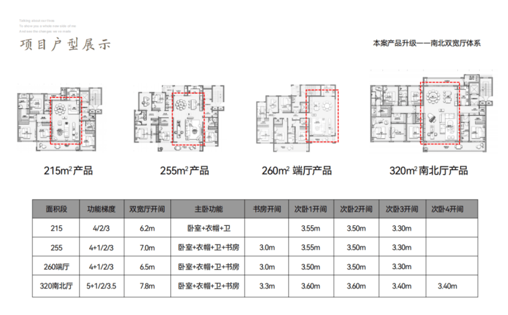 主力户型面积215、255、260、320㎡(另有底跃户型),全部双宽厅设计、带独立储藏间,最小开间6.2米起、主卧全部套房设计,4房2厅3卫起步,项目无论是面积段还是户型设计与仙林湖的高科紫星堂非常相似。