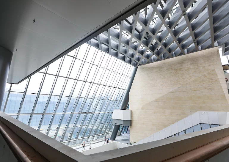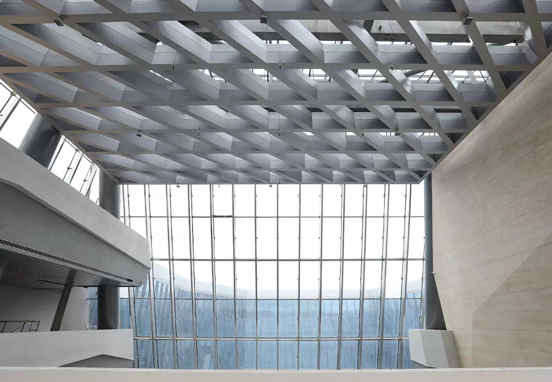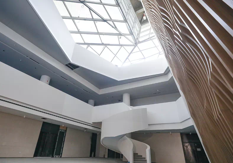 ▍入口通过入口的大台阶,可以直接进入位于二楼的大厅,玻璃结构让整个空间通透明亮,三楼四楼主要是各大展厅,部分展板已经安装完毕。