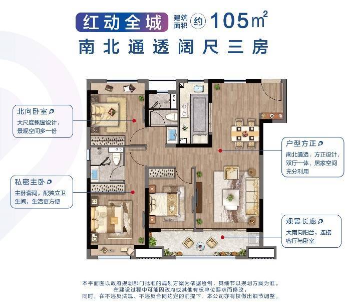 建面约105㎡舒居三室,生活更加精彩,尽情享受时光,不负美好期待。大一点,让生活更从容。