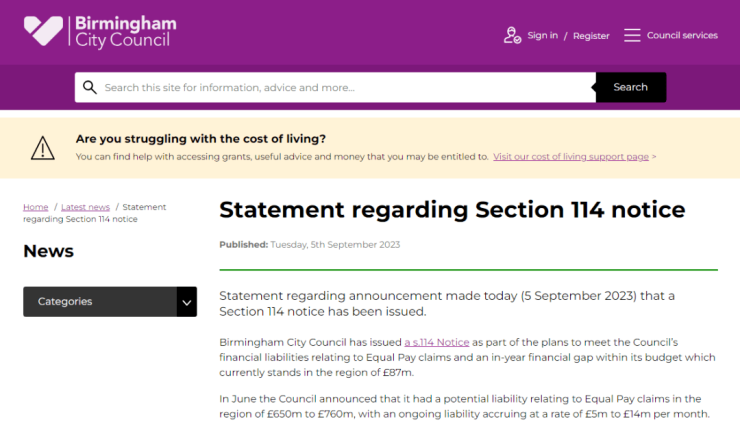 鉴于这样的情况,该市议会的临时财务总监Fiona Greenway发出了“第114条通知”,该通知证实,该市已经没有足够的资金来支付同工同酬问题相关的索赔,也没有其他办法筹到款项。