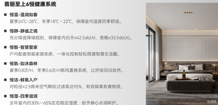 回归到居住本身,翡丽铂湾认为建筑标准的革新是为了超越现有的生活境界,也是人类价值不断演化的终极追求。打造六恒科技系统,在“恒温、恒静、恒氧、恒洁、恒湿、恒智”的量化下,从空气、温度、声音等维度智能守护人居的健康状况,以进化的姿态,把以人为本的时代精神内化为健康建筑内涵。