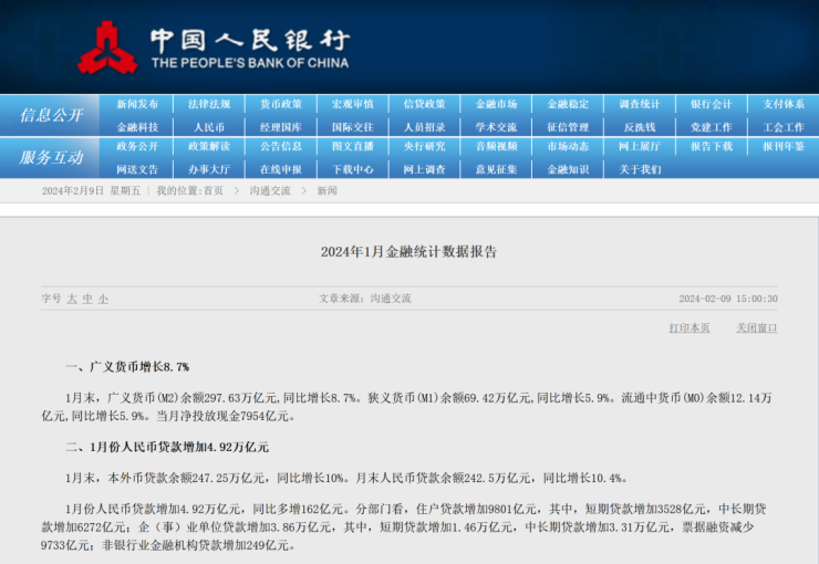 2月9日,中国人民银行公布2024年1月金融统计数据报告。