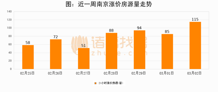 根据诸葛找房数据显示,南京24小时涨价房源量为115套,较03月01日增加30套,环比上涨35.3%。与此同时,涨价房源占比小幅扩大,业主信心有所提升。