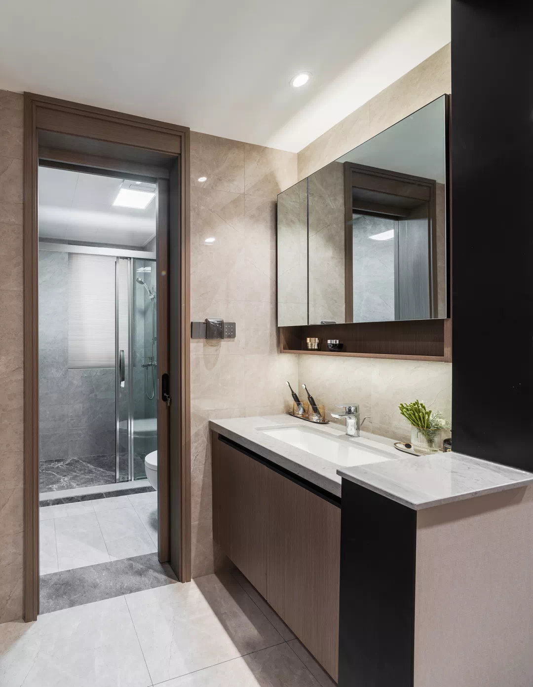 所有户型的卫生间均采用了三段式设计,将台盆设置在了卫生间门外,不仅避免水渍外溅,滋生细菌,更避免洗漱如厕同时使用的尴尬。