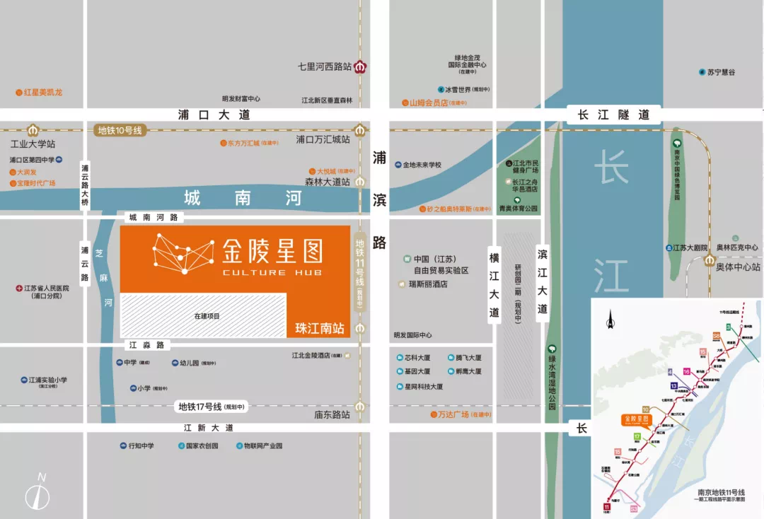 交通方面,项目紧邻在建的地铁11号线珠江南站,预计2025年通车,这条线路将桥北、老浦口、江核、城南中心、研创园等板块一一串联,未来将设置9个换乘站点,与10条线路实现换乘,通达性非常高。