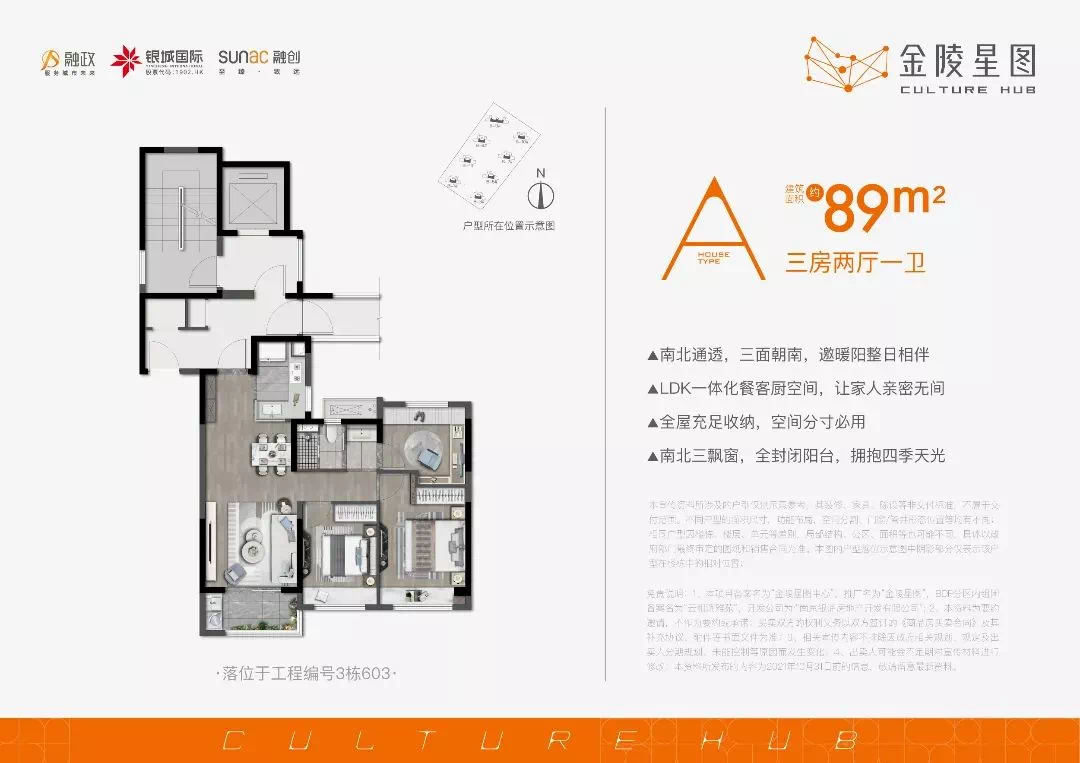 建面约89平户型为三房两厅一卫设计,三开间朝南,南向9.3米超大尺度,采光充足,居住舒适度一点也不输大户型。同时全卧室引入飘窗,在阳台设计转角窗,扩大采光面积。