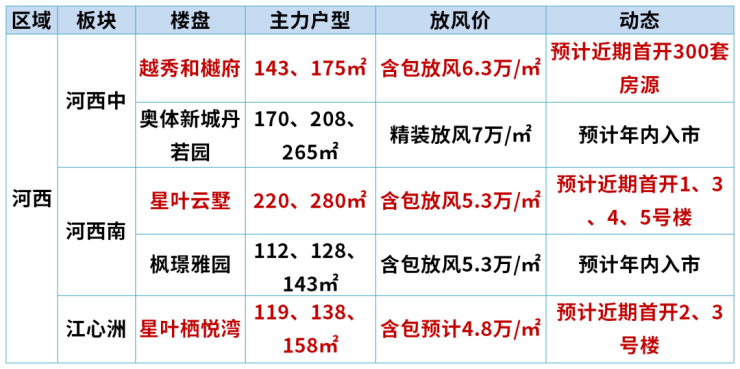 年底,河西中、河西南、江心洲都有买房机会,预计有5家纯新盘即将上市,其中河西中越秀和樾府、河西南星叶云墅、江心洲星叶栖悦湾将于近期首开。