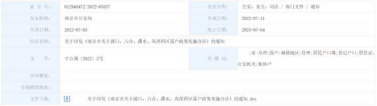 为贯彻《南京市政府办公厅关于进一步推动非户籍人口在城市落户的实施意见》的有关要求,进一步推进户籍制度改革,经市局研究决定,实施《南京市关于浦口、六合、溧水、高淳四区落户政策的实施办法》,有效期设为三年,至2025年7月4日。