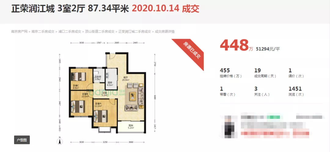 去年10月份,正荣润江城一套87.34㎡的二手房以总价448万成交,单价达到了惊人的51294元/㎡!