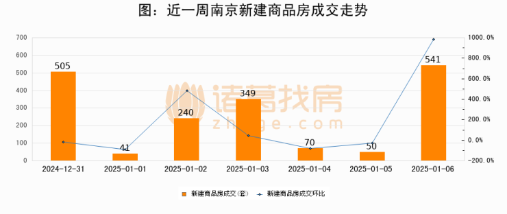 根据南京市住房保障和房产局数据显示,2025年01月06日南京新建商品房成交541套,较昨日增加491套,环比上涨982%