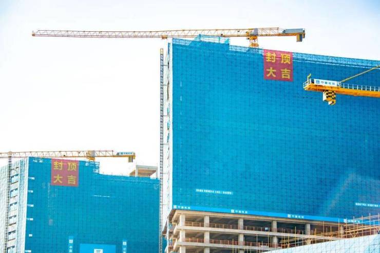 近日,位于南部新城内部的中芬合作交流中心超时序进度提前2个月主体封顶。在施工现场,这座“冰立方”3栋高楼主体已经挂上了“封顶大吉”的标语,不少工人正在现场有序施工,几座塔吊挥舞着“臂膀”,一派热火朝天的景象。据悉,该项目预计2024年下半年竣工。